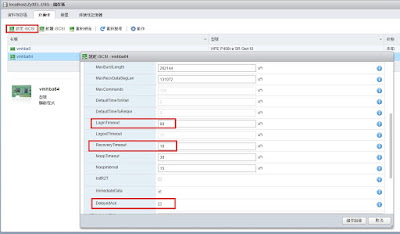 4. 點選"介面卡"標籤頁,選擇"設定iSCSI",進入設定畫面後展開"進階設定",LoginTimeout:將數值從 5 修改到 60,NoopTimeout:將數值從 10 修改到 30,DelayedAck:取消勾選以關閉 DelayedACK,這部分的設定是 Synology 官方網站建議值。[原文出處]